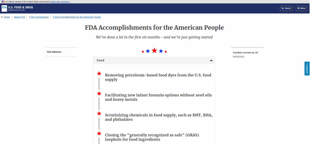 これが一番わかりにくいのですが、おそらく動物性脂肪を食べすぎることは健康上好ましくないという栄養学的常識を覆したとMakary長官が思っている、ことを指すのだと思います。MAHA報告書では学校への全乳の復活という形で記載されていましたが、別に動物性脂肪は禁止されていたわけではないしFDAの管轄でもないと思います。