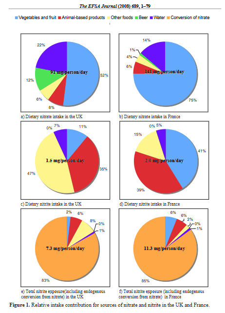 Figure 1.  Relative intake contribution for sources of nitrate and nitrite in the UK and France