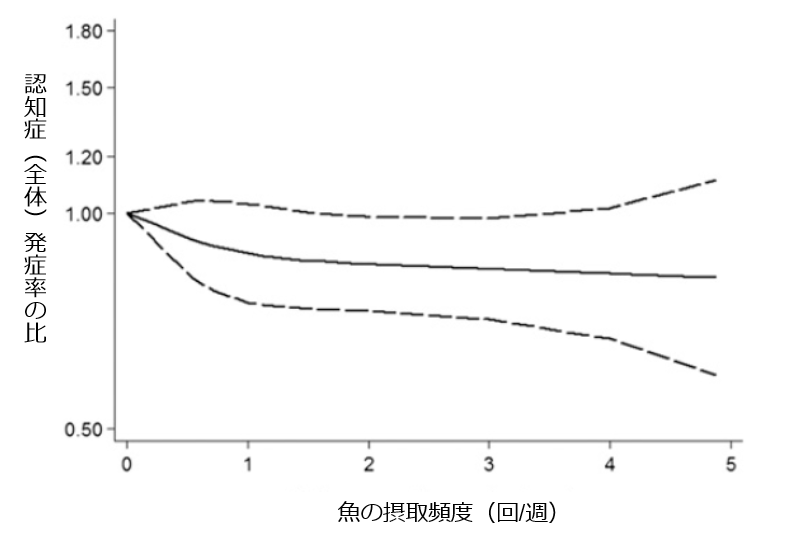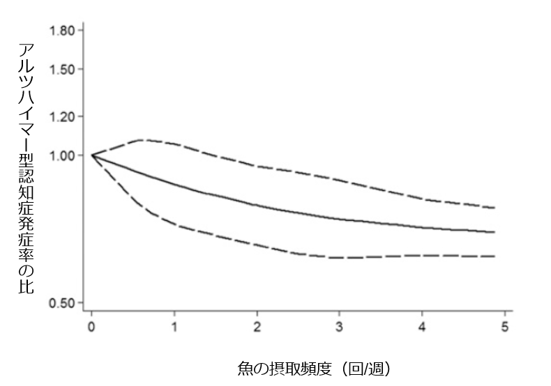 一方で(B)のアルツハイマー型認知症では、魚の摂取頻度が週に3回より多くなってくると、発症が少なくなる傾向が認められました。